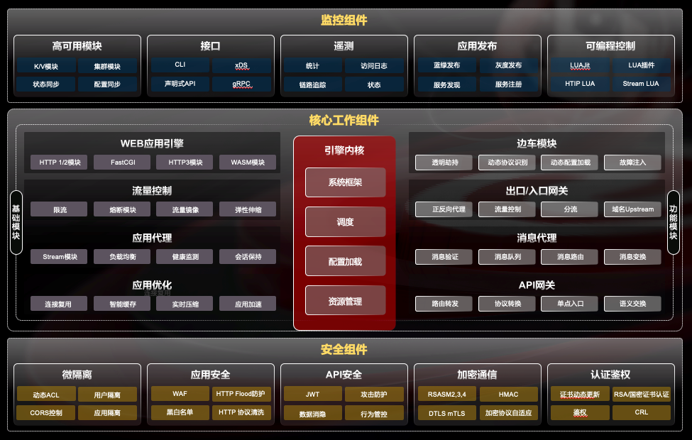 李剛強(qiáng)調(diào),“OpenNJet 充分吸收了開源生態(tài)的優(yōu)秀擴(kuò)展模塊 ,在功能規(guī)劃上包含了5大類18類組件,特別是隨著安全威脅的快速增加,規(guī)劃了安全組件。除安全功能外,‘企業(yè)特性’也是OpenNJet關(guān)注的重點(diǎn)領(lǐng)域,如內(nèi)置的高可用性,自動(dòng)化的集群發(fā)現(xiàn)及配置同步等?!?/p>