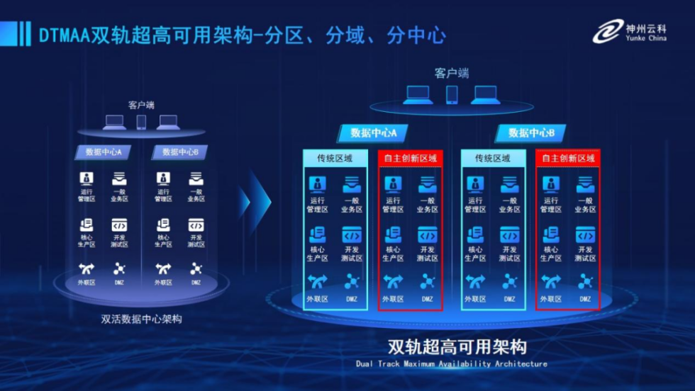 為幫助金融客戶更好地應(yīng)對數(shù)字經(jīng)濟(jì)時代對可持續(xù)性的高要求,實現(xiàn)“信創(chuàng)”與“數(shù)字化”齊頭并進(jìn),leyu.樂魚推出了雙軌超高可用架構(gòu)。該架構(gòu)在雙活數(shù)據(jù)中心的分區(qū)調(diào)度基礎(chǔ)上,增加信創(chuàng)域和非信創(chuàng)域的分域調(diào)度,實行信創(chuàng)域與傳統(tǒng)域應(yīng)用全量部署,使雙中心運(yùn)營變?yōu)殡p中心四區(qū)域并行運(yùn)行,互為多活,將“0到1”的單軌建設(shè)道路變?yōu)榉謪^(qū)分域協(xié)同的多活雙軌超高可用架構(gòu)。幫助客戶在新架構(gòu)下,保障“信創(chuàng)”的同時解決性能瓶頸,提升穩(wěn)定性,保證應(yīng)用可持續(xù)性,最終實現(xiàn)信創(chuàng)區(qū)域和非信創(chuàng)區(qū)域的平滑過渡,完成國產(chǎn)化替代目標(biāo)。