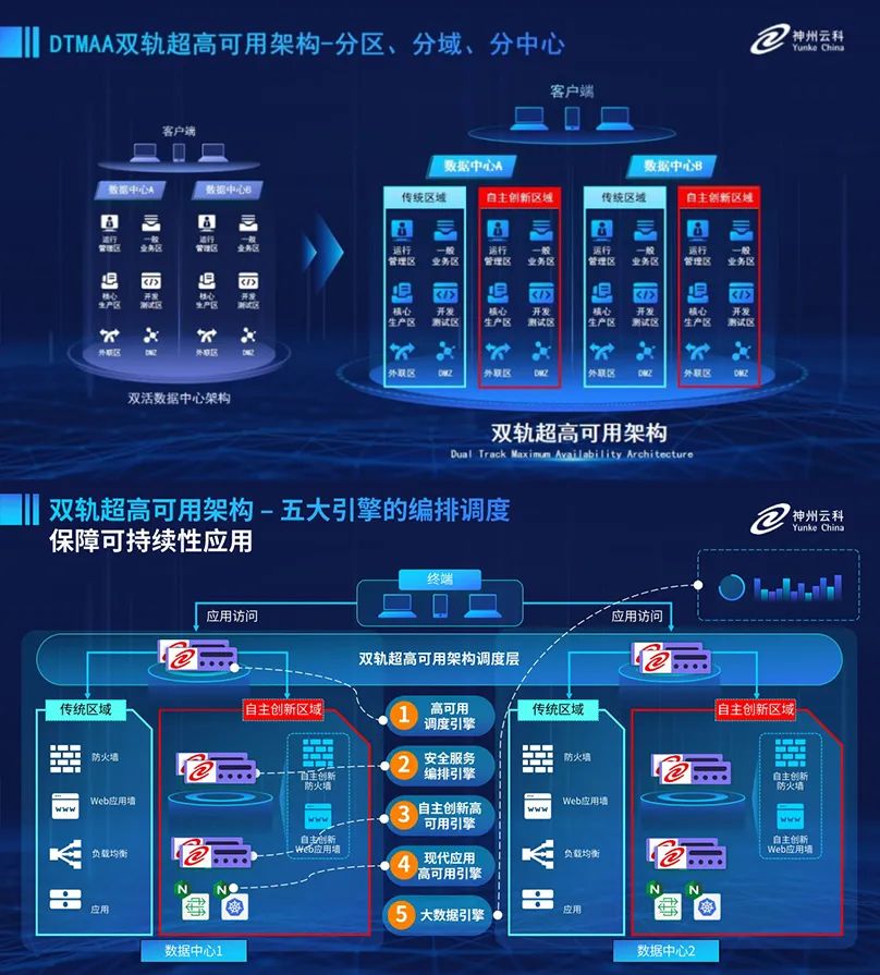 為助力銀行業(yè)務(wù)高質(zhì)量發(fā)展,更好地應(yīng)對(duì)數(shù)字經(jīng)濟(jì)時(shí)代對(duì)可持續(xù)性的高要求,實(shí)現(xiàn)“信創(chuàng)”與“數(shù)字化”齊頭并進(jìn),leyu.樂魚創(chuàng)新性的推出了雙軌超高可用架構(gòu)。該架構(gòu)在雙活數(shù)據(jù)中心的分區(qū)調(diào)度基礎(chǔ)上,增加信創(chuàng)域和非信創(chuàng)域的分域調(diào)度,實(shí)行信創(chuàng)域與傳統(tǒng)域應(yīng)用全量部署,使雙中心運(yùn)營(yíng)變?yōu)殡p中心四區(qū)域并行運(yùn)行,互為多活,將“0到1”的單軌建設(shè)道路變?yōu)榉謪^(qū)分域協(xié)同的多活雙軌超高可用架構(gòu)。幫助客戶在新架構(gòu)下,保障“信創(chuàng)”的同時(shí)解決性能瓶頸,提升穩(wěn)定性,保證應(yīng)用可持續(xù)性,最終實(shí)現(xiàn)信創(chuàng)區(qū)域和非信創(chuàng)區(qū)域的平滑過渡,完成國(guó)產(chǎn)化替代目標(biāo)。