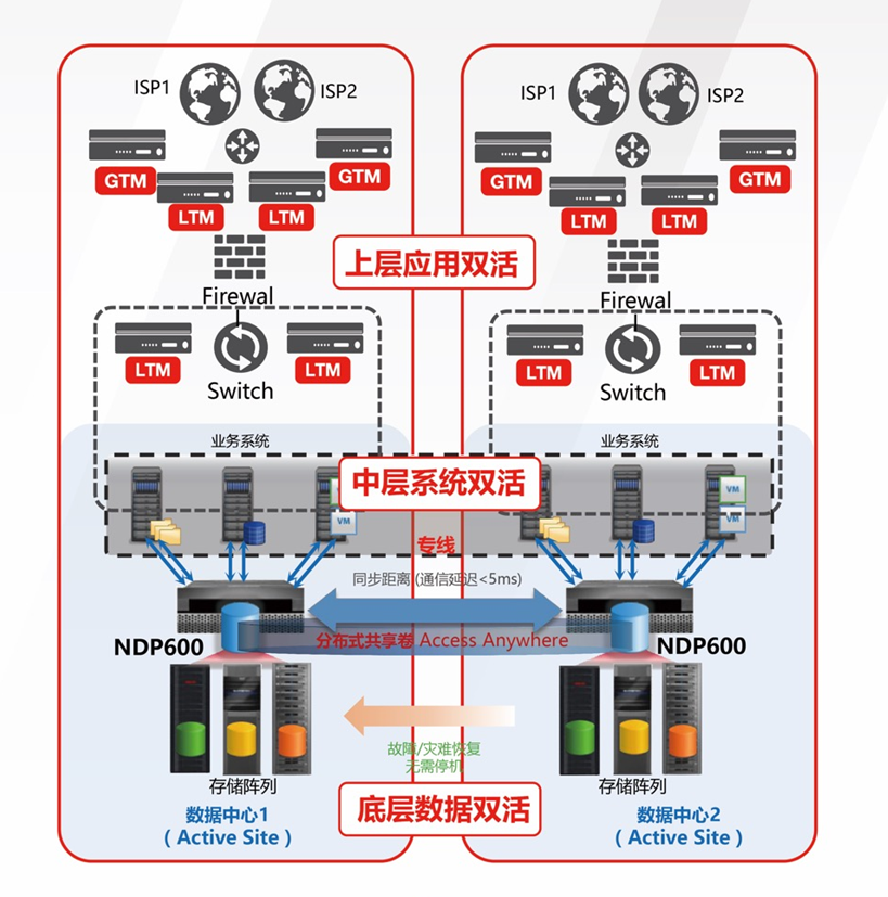 通過(guò)NDP600集中存儲(chǔ)的雙活架構(gòu),實(shí)現(xiàn)底層數(shù)據(jù)的兩端一致性